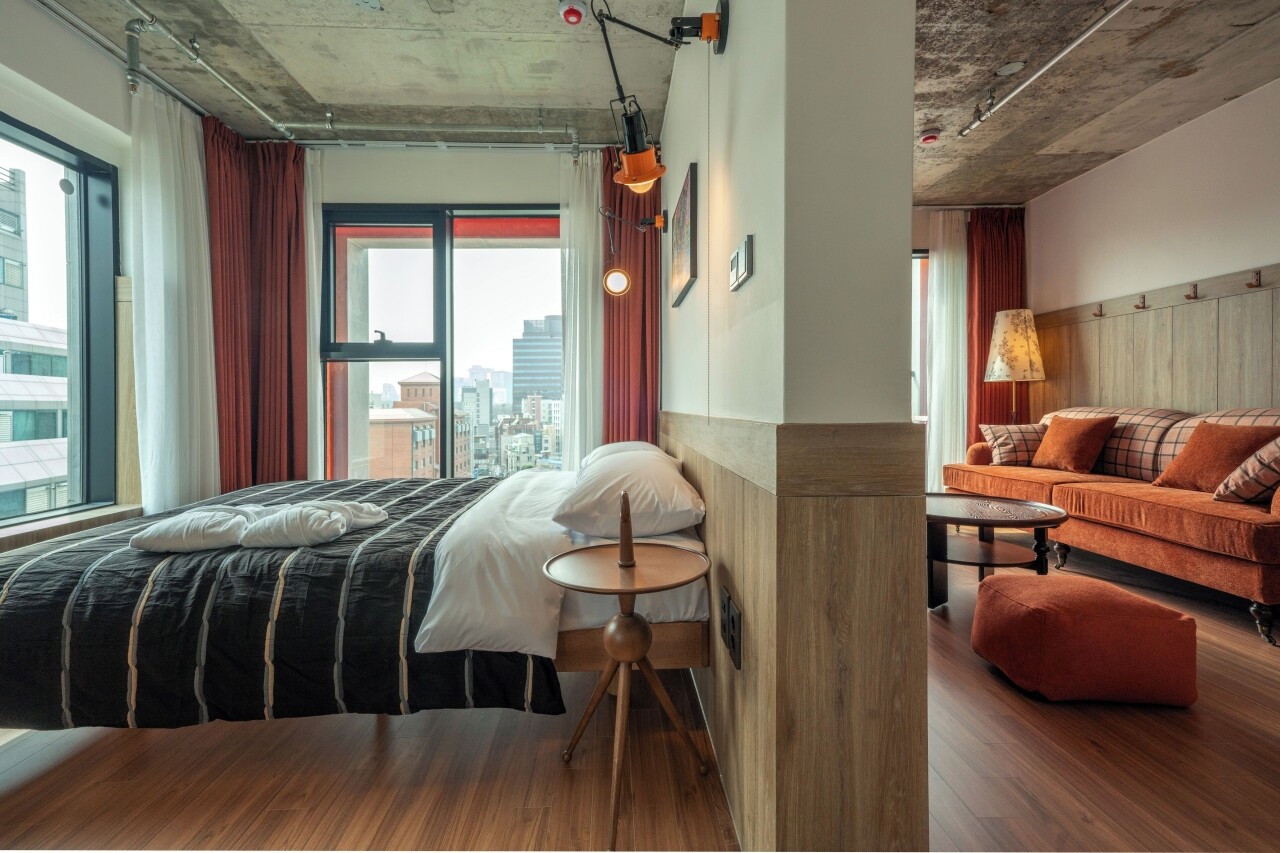 브루클린 블루스 호텔은 3층부터 10층까지 총 32개의 객실과 스위트룸을 보유하고 있습니다. 노출 콘크리트와 미국식 복고풍 레이아웃을 바탕으로 한 밝은 인더스트리얼 디자인이 특징이며, 각 층에는 4개의 객실만 있습니다. 더블룸은 일반적으로 넓지는 않지만, 모든 객실에 대형 창문과 전용 발코니가 있어 탁 트인 채광과 전망을 제공하며, 답답함을 크게 줄여줍니다.